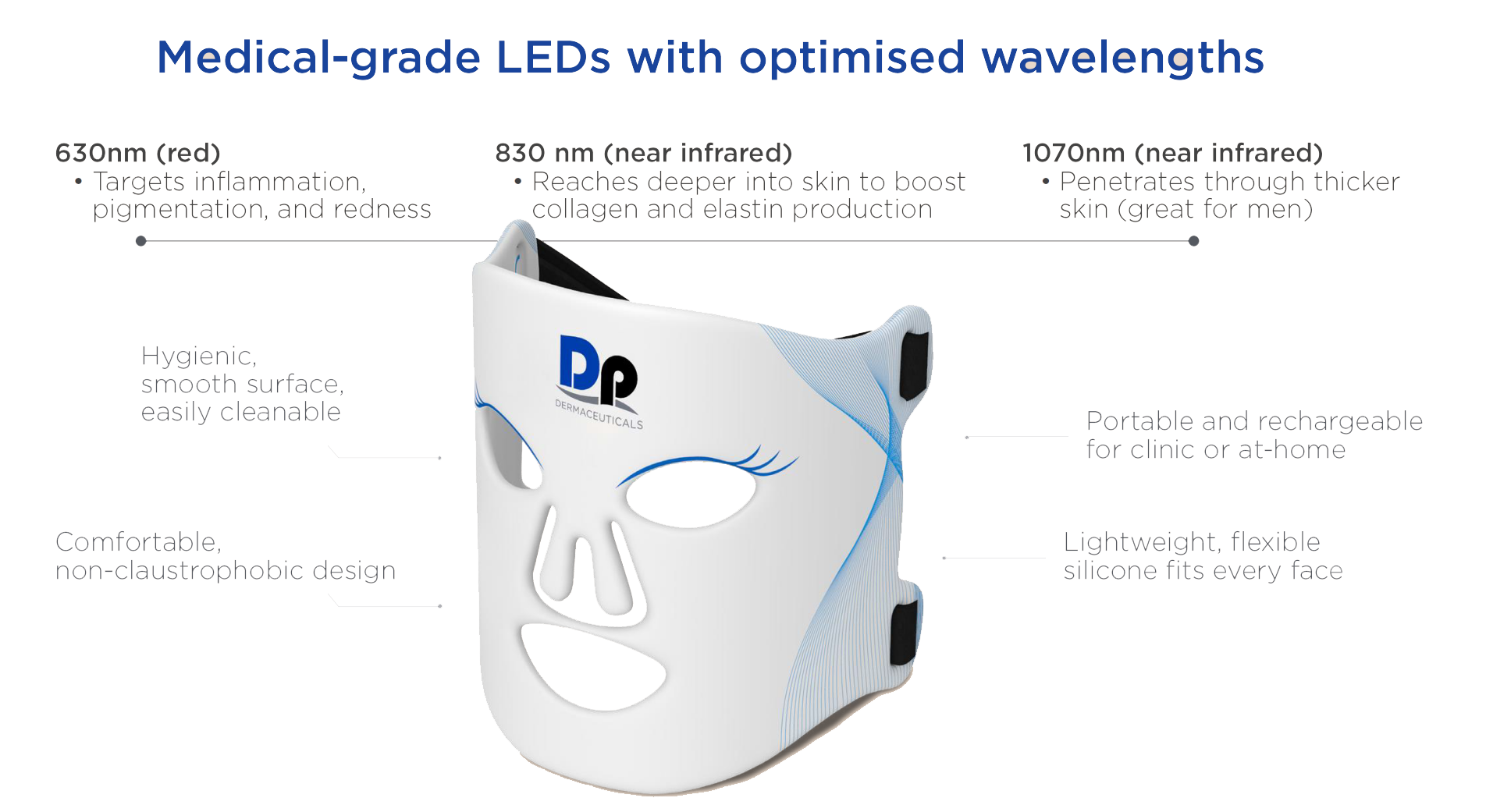 Die wichtigste Neuerung der neuen LED-Maske ist die Ergänzung der beiden bisherigen Wellenlängen 630 nm und 830 nm um eine dritte Wellenlänge von 1070 nm, während das Vorgängermodell nur zwei Wellenlängen (630 nm und 830 nm) bot.