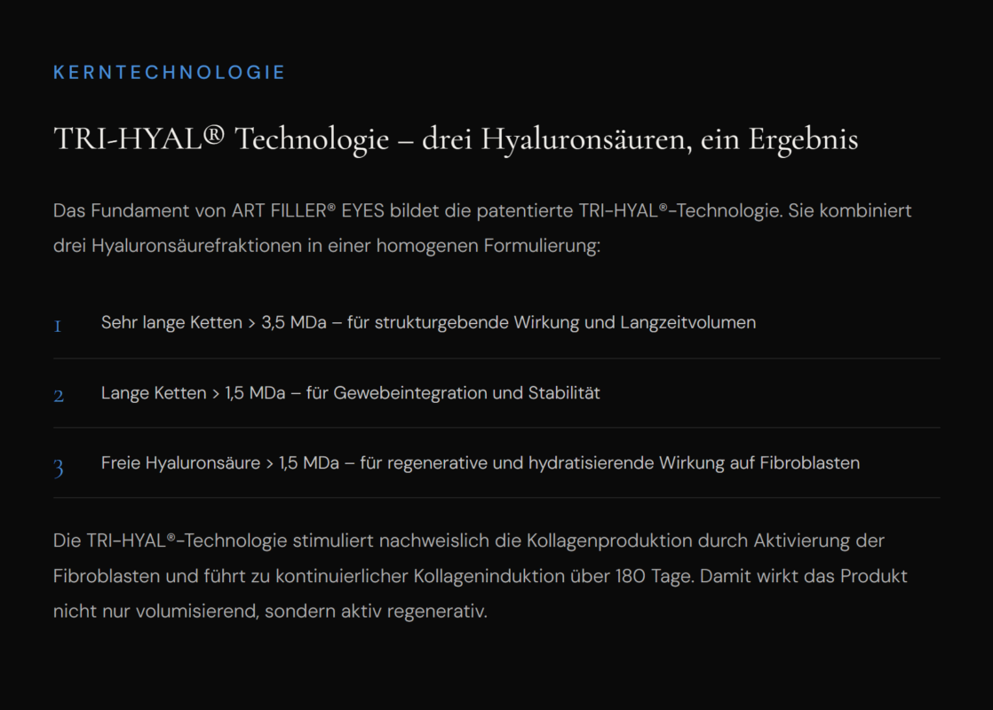 ART FILLER® EYES überzeugt durch eine Kombination, die im periorbitalen Segment selten vereint ist: klinisch belegte Wirksamkeit über bis zu 18 Monate, eine hervorragende Sicherheitsbilanz mit minimaler Schwellungsrate und Tyndall-Effekt sowie eine aktiv regenerative Wirkung durch die TRI-HYAL®-Technologie.