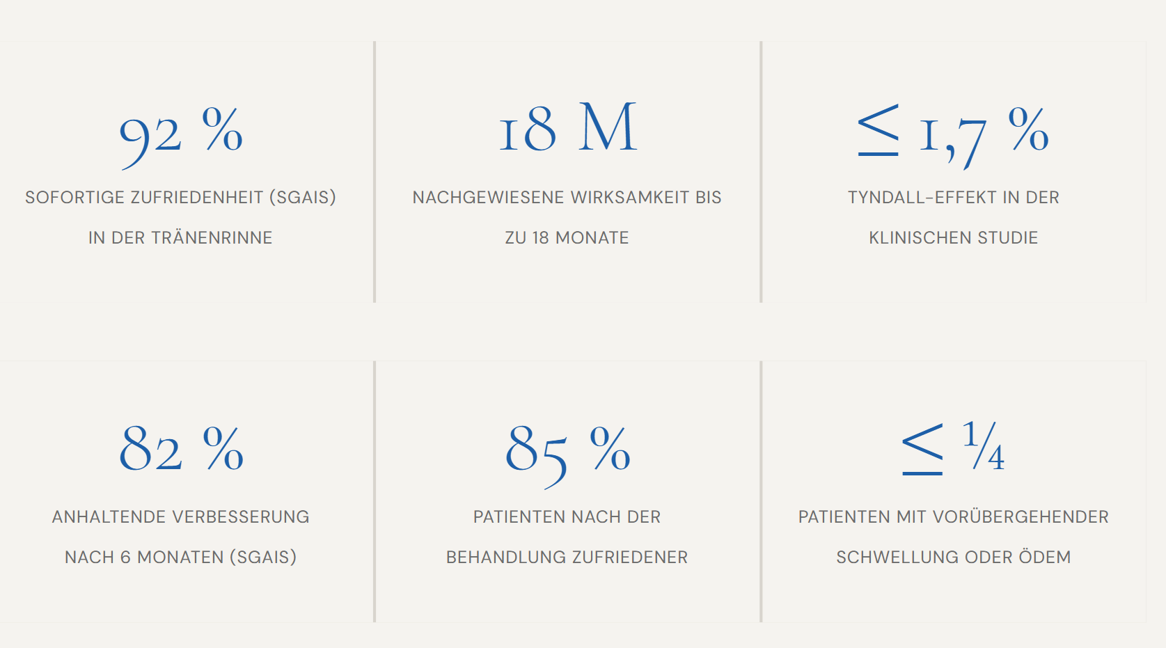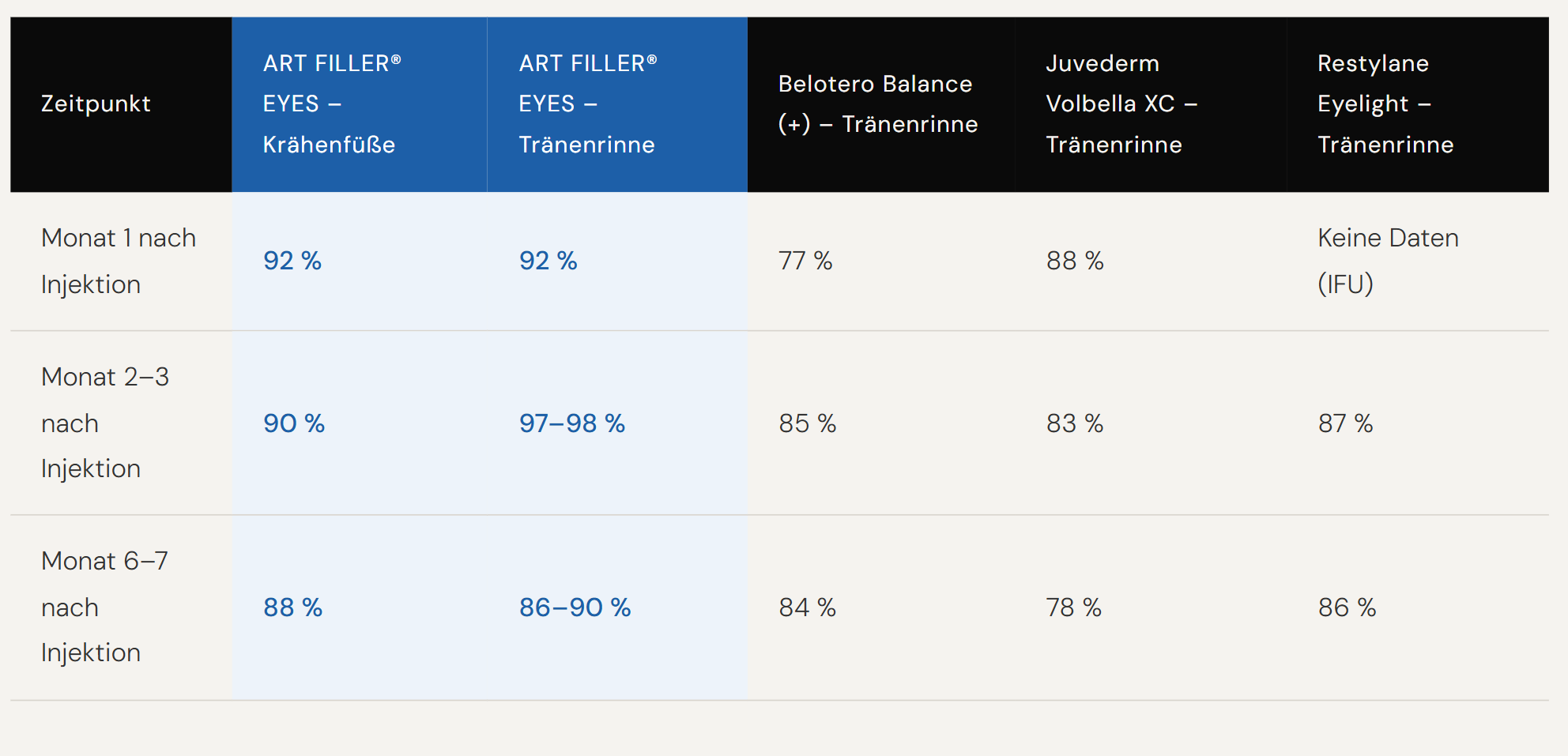 Die folgende Tabelle vergleicht die Responderraten ausgewählter periorbitaler Filler auf Basis verfügbarer klinischer Daten. Als Respondent gilt, wer eine Verbesserung von mindestens einer Stufe erzielt.